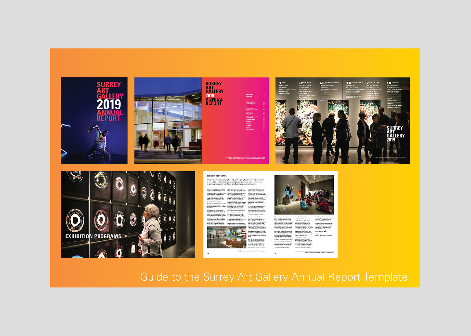 CREDITS Graphic Design: That Blue; with Suvi Bains, Surrey Art Gallery. View the published Surrey Art Gallery 2019 Annual Report produced by gallery staff using the template. Artists whose works are featured include Omer Abel, Faisal Anwar, Nicoletta Baumeister, Sammy Chien, Robert Youds, and more. Photographs: Blaine Campbell, Brian Giebelhaus, Scott Massey, Jon McRae, SITE Photography, gallery staff, and others. Thank you to all artists and photographers represented in these works. For full details, see the published document at the link above.